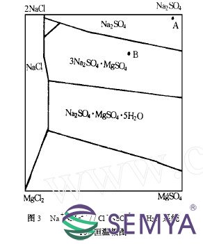 無(wú)水硫酸鈉生產(chǎn)所使用的原料中,除了主要的Na+ 、SO42 -離子外,一般都含有少量的Ca2 + 、Mg2 + 、和Cl -離子,生產(chǎn)時(shí)蒸發(fā)器內(nèi)壓力、溫度等條件保持不變,隨著蒸發(fā)的進(jìn)行,結(jié)晶的硫酸鈉不斷取出, 料液中Ca2 + 、Mg2 + 離子濃度相對(duì)增大, 體現(xiàn)在Na + 、Mg2 + // Cl -、SO42--H2O 相圖上,如開(kāi)始在A 點(diǎn),生產(chǎn)一段時(shí)間后體系移到B 點(diǎn)見(jiàn)圖2, 繼續(xù)生產(chǎn),體系逐漸由Na2SO4 的結(jié)晶區(qū)移到Na2SO4 與復(fù)鹽3Na2SO4 ·MgSO4 的共飽線上,此時(shí)無(wú)水鈉鎂礬開(kāi)始析出,在操作溫度不變情況下,體系將沿此共飽線移動(dòng),產(chǎn)品質(zhì)量開(kāi)始下降。如果溫度升高時(shí),Na2SO4 的結(jié)晶區(qū)逐漸縮小,而3Na2SO4 ·MgSO4 的結(jié)晶區(qū)逐漸增大, 體系落在了3Na2SO4 ·MgSO4的結(jié)晶區(qū),顯然此時(shí)已不是我們所需要的產(chǎn)品了見(jiàn)圖3 。由于無(wú)水鈉鎂礬的結(jié)晶顆細(xì)小,在粘度較大的硫酸鈉溶液中不易沉降,蒸發(fā)罐內(nèi)就會(huì)呈現(xiàn)糊狀,使蒸發(fā)無(wú)法正常進(jìn)行,結(jié)晶也不會(huì)再繼續(xù)長(zhǎng)大,排出的料液經(jīng)離心機(jī)脫水非常困難,濕硝中母液含量較大,氣流干燥也無(wú)法正常運(yùn)行,產(chǎn)品放置時(shí)間長(zhǎng)了便結(jié)為大塊。為避免上述現(xiàn)象發(fā)生,除對(duì)硝液進(jìn)行凈化外,應(yīng)適當(dāng)降低排料溫度,即降低蒸發(fā)終溫。從圖2 、圖3 中可以看出,Na2SO4的結(jié)晶區(qū)隨著溫度的降低而增大,這不僅提高了產(chǎn)品產(chǎn)量,而且極大的降低了雜鹽的析出量,大大提高了產(chǎn)品質(zhì)量。那么是不是排料溫度越低越好呢? 也不是,圖4 是Na2SO4 -H2O 系統(tǒng)相圖,從圖中可以看出,硫酸鈉溶解度在32138 ℃最大,低于此溫度時(shí),系統(tǒng)不再結(jié)晶Na2 SO4 , 而是結(jié)晶出Na2 SO4 ·10H2O 。當(dāng)料液溫度接近32138 ℃時(shí), 由于硫酸鈉溶解度增大,產(chǎn)量將受到影在水中響, 這對(duì)生產(chǎn)是不利的。