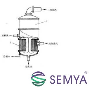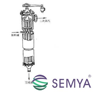 上述各種蒸發器的主要缺點是加熱室內滯料量大,致使物料在高溫下停留時間長,特別不適于處理熱敏性物料。在膜式蒸發器內,溶液只通過加熱室一次即可濃縮到需要的濃度,停留時間僅為數秒或十余秒鐘。操作過程中溶液沿加熱管壁呈傳熱效果最佳的膜狀流動。