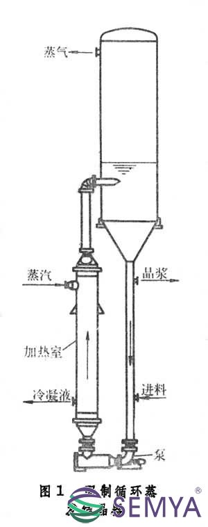 強制循環蒸發結晶器 一種晶漿循環式連續結晶器(圖1)。操作時,料液自循環管下部加入,與離開結晶室底部的晶漿混合后,由泵送往加熱室。晶漿在加熱室內升溫(通常為2~6℃),但不發生蒸發。熱晶漿進入結晶室后沸騰,使溶液達到過飽和狀態,于是部分溶質沉積在懸浮晶粒表面上,使晶體長大。作為產品的晶漿從循環管上部排出。強制循環蒸發結晶器生產能力大,但產品的粒度分布較寬。