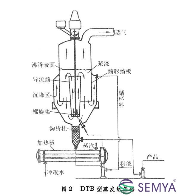 DTB型蒸發結晶器 即導流筒-擋板蒸發結晶器,也是一種晶漿循環式結晶器(見彩圖)。器下部接有淘析柱,器內設有導流筒和筒形擋板,操作時熱飽和料液連續加到循環管下部,與循環管內夾帶有小晶體的母液混合后泵送至加熱器。加熱后的溶液在導流筒底部附近流入結晶器,并由緩慢轉動的螺旋槳沿導流筒送至液面。溶液在液面蒸發冷卻,達過飽和狀態,其中部分溶質在懸浮的顆粒表面沉積,使晶體長大。在環形擋板外圍還有一個沉降區。在沉降區內大顆粒沉降,而小顆粒則隨母液入循環管并受熱溶解。晶體于結晶器底部入淘析柱。為使結晶產品的粒度盡量均勻,將沉降區來的部分母液加到淘析柱底部,利用水力分級的作用,使小顆粒隨液流返回結晶器,而結晶產品從淘析柱下部卸出(圖2)。