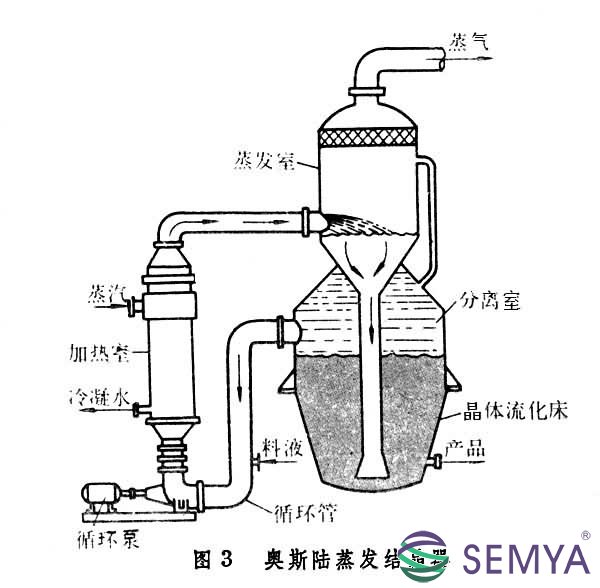 奧斯陸型蒸發結晶器 又稱為克里斯塔爾結晶器, 一種母液循環式連續結晶器(圖3)。操作的料液加到循環管中,與管內循環母液混合,由泵送至加熱室。加熱后的溶液在蒸發室中蒸發并達到過飽和,經中心管進入蒸發室下方的晶體流化床(見流態化)。在晶體流化床內,溶液中過飽和的溶質沉積在懸浮顆粒表面,使晶體長大。晶體流化床對顆粒進行水力分級,大顆粒在下,而小顆粒在上,從流化床底部卸出粒度較為均勻的結晶產品。流化床中的細小顆粒隨母液流入循環管,重新加熱時溶去其中的微小晶體。若以冷卻室代替奧斯陸蒸發結晶器的加熱室并除去蒸發室等,則構成奧斯陸冷卻結晶器。這種設備的主要缺點是溶質易沉積在傳熱表面上,操作較麻煩,因而應用不廣泛。