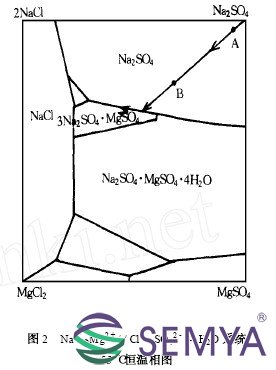無(wú)水硫酸鈉生產(chǎn)所使用的原料中,除了主要的Na+ 、SO42 -離子外,一般都含有少量的Ca2 + 、Mg2 + 、和Cl -離子,生產(chǎn)時(shí)蒸發(fā)器內(nèi)壓力、溫度等條件保持不變,隨著蒸發(fā)的進(jìn)行,結(jié)晶的硫酸鈉不斷取出, 料液中Ca2 + 、Mg2 + 離子濃度相對(duì)增大, 體現(xiàn)在Na + 、Mg2 + // Cl -、SO42--H2O 相圖上,如開(kāi)始在A 點(diǎn),生產(chǎn)一段時(shí)間后體系移到B 點(diǎn)見(jiàn)圖2, 繼續(xù)生產(chǎn),體系逐漸由Na2SO4 的結(jié)晶區(qū)移到Na2SO4 與復(fù)鹽3Na2SO4 ·MgSO4 的共飽線上,此時(shí)無(wú)水鈉鎂礬開(kāi)始析出,在操作溫度不變情況下,體系將沿此共飽線移動(dòng),產(chǎn)品質(zhì)量開(kāi)始下降。如果溫度升高時(shí),Na2SO4 的結(jié)晶區(qū)逐漸縮小,而3Na2SO4 ·MgSO4 的結(jié)晶區(qū)逐漸增大, 體系落在了3Na2SO4 ·MgSO4的結(jié)晶區(qū),顯然此時(shí)已不是我們所需要的產(chǎn)品了見(jiàn)圖3 。由于無(wú)水鈉鎂礬的結(jié)晶顆細(xì)小,在粘度較大的硫酸鈉溶液中不易沉降,蒸發(fā)罐內(nèi)就會(huì)呈現(xiàn)糊狀,使蒸發(fā)無(wú)法正常進(jìn)行,結(jié)晶也不會(huì)再繼續(xù)長(zhǎng)大,排出的料液經(jīng)離心機(jī)脫水非常困難,濕硝中母液含量較大,氣流干燥也無(wú)法正常運(yùn)行,產(chǎn)品放置時(shí)間長(zhǎng)了便結(jié)為大塊。為避免上述現(xiàn)象發(fā)生,除對(duì)硝液進(jìn)行凈化外,應(yīng)適當(dāng)降低排料溫度,即降低蒸發(fā)終溫。從圖2 、圖3 中可以看出,Na2SO4的結(jié)晶區(qū)隨著溫度的降低而增大,這不僅提高了產(chǎn)品產(chǎn)量,而且極大的降低了雜鹽的析出量,大大提高了產(chǎn)品質(zhì)量。那么是不是排料溫度越低越好呢? 也不是,圖4 是Na2SO4 -H2O 系統(tǒng)相圖,從圖中可以看出,硫酸鈉溶解度在32138 ℃最大,低于此溫度時(shí),系統(tǒng)不再結(jié)晶Na2 SO4 , 而是結(jié)晶出Na2 SO4 ·10H2O 。當(dāng)料液溫度接近32138 ℃時(shí), 由于硫酸鈉溶解度增大,產(chǎn)量將受到影在水中響, 這對(duì)生產(chǎn)是不利的。